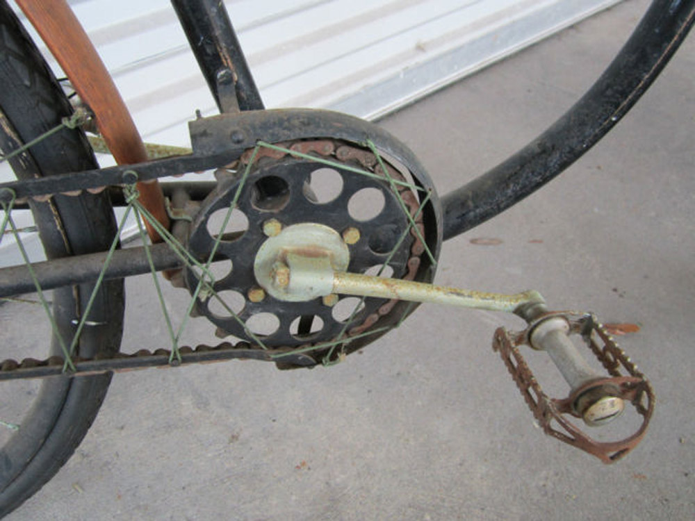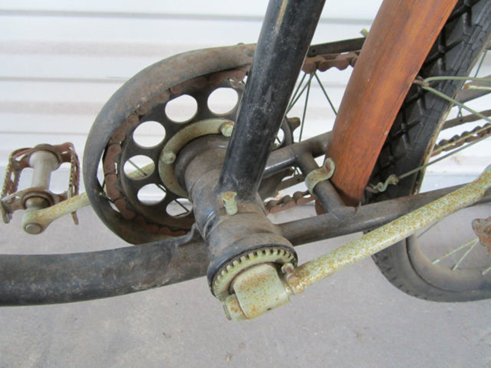 Brake handle and spoon are missing. The rims and the rear fender are made of wood, which makes this a very early bike to use wood for these parts. It has pneumatic tires of the tube type. At the time (until 1900), there were no front mudguards for ladies bikes. They were not supposed to go cycling in the rain, I guess.