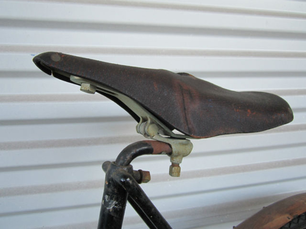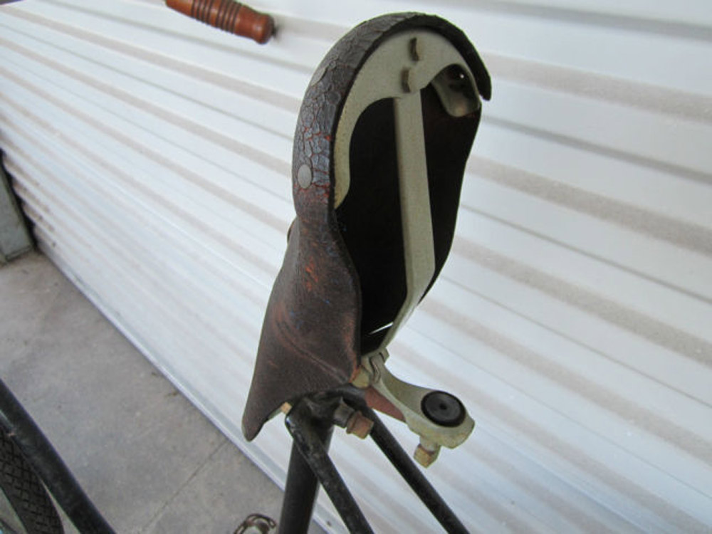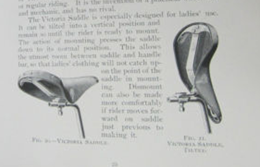 The saddle is original and of a very special construction. The position is vertical until the lady mounts the bike. The catalogue sais: 'The action of mounting pushes the saddle into its normal position. (...) ladies clothing will not catch upon the point of the saddle in mounting. Dismount can also be made more comfortably if rider moves forward'.